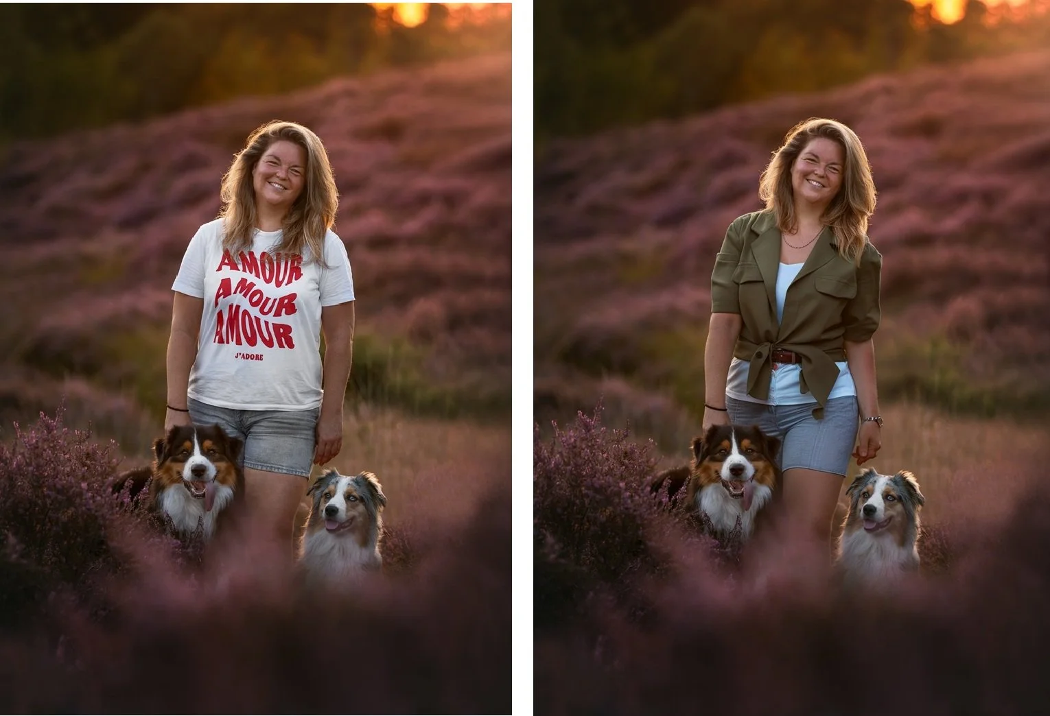 Dus, nu ik je hopelijk heb kunnen overtuigen om in ieder geval één foto samen met je hond te maken, laat me je zien hoe wat we dragen invloed kan hebben op hoe de foto’s aanvoelen.